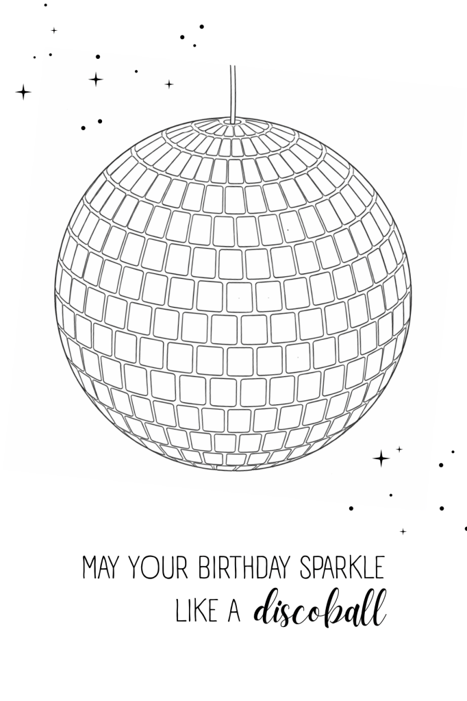 Met mijn MarkLife X4 printte ik de freebie hieronder uit op een witte sticker van 10×15 cm. Ik kleurde een aantal vakjes van de discobal in met mijn Quicky Glue pen van Sakura. Dit is een rollerpen met lijminkt. Het heeft een blauw kleurtje zodat je kunt zien waar je de inkt aanbrengt. Het blauwe kleurtje verdwijnt zodra de inkt droogt. Er blijft dan een plakkerig laagje achter. Na het aanbrengen wacht je 30 minuten. Hierna breng je de hotfoil aan. Wrijf met je vinger op de plekken waar je de lijm hebt aangebracht over de folie en trek voorzichtig de folie eraf. Wat een gaaf effect hè! Hotfoil is er in veel verschillende kleuren.